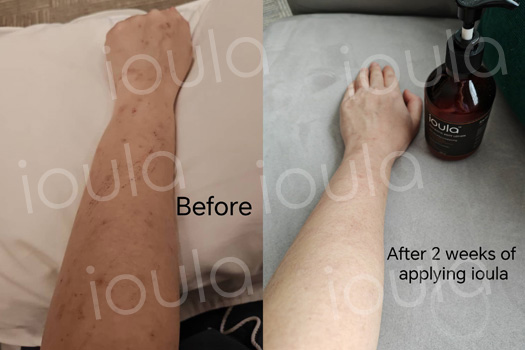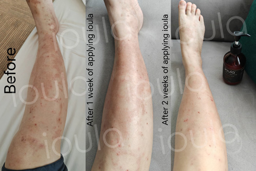 One week after application, the itchiness had stopped and new secondary wounds had not developed. By the second week, there were no more secondary wounds and the darkness from the healing wounds had begun to lighten. She was very grateful that ioula’s Body Lotion was able to help her.